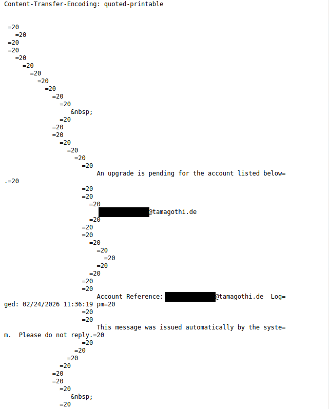 Das ist also klares Phishing oder eine andere Form des Betrugs. Der „wichtige Teil“ der Nachricht ist auch kein Text, sondern ein PNG-Bild mit Text, um an den Spamfiltern vorbeizukommen – was hier übrigens geradezu lächerlich gescheitert ist. Übrigens hat auch die geradezu künstlerische Formatierung der Reintext-Version im Quelltext dieser Spam nicht gehofen. Die Spam sieht so aus:
