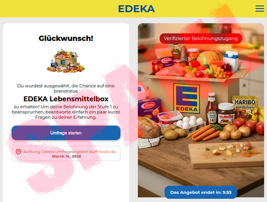 *Diese Website ist nicht mit EDEKA oder einer ähnlichen Marke verbunden oder von ihr unterstützt und beansprucht keine Markenrechte oder Eigentumsrechte an diesen Produkten, die Eigentum ihrer jeweiligen Inhaber bleiben. Die Teilnahme an dieser Umfrage ist freiwillig und garantiert keinen Gewinn. Drittanbieterangebote, die mit dieser Umfrage verknüpft sind, können zusätzliche Anforderungen haben, wie Teilnahmegebühren oder Abonnements; bitte prüfen Sie alle Bedingungen auf der Drittanbieter-Website. Es ist kein Kauf oder keine Zahlung erforderlich, um an dieser Umfrage teilzunehmen. Für vollständige Informationen siehe unsere Nutzungsbedingungen.