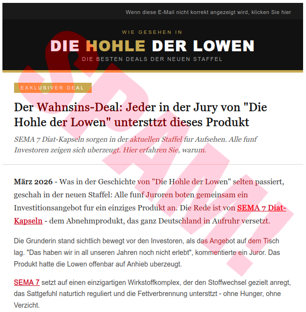 Natürlich soll man Gewicht mit einem Wundermittel verlieren. Das jüngste Wundermittel aus der angeblichen „Höhle der Löwen“ heißt SEMA 7. Natürlich hat es die Sendung niemals gegeben und von den wundersamen Wampenkapseln erfährt man nur aus seiner Spam.